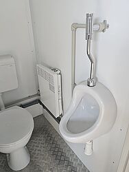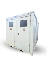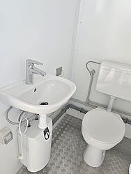 TOI® ROCKY DUO combines robustness, flexibility, and comfort. The mobile sanitary module is fully insulated and withstands all weather conditions, including heat and cold. Both the interior and exterior finishes are of high quality. It is an ideal product for events and construction projects. The module is equipped with lighting and requires connections to a water supply, sewage system, and electrical connection.