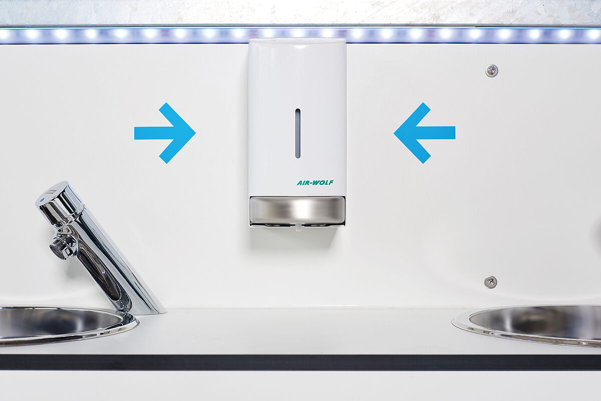 No sólo la higiene, sino también la apariencia es correcta: En cada lado, hay cuatro lavabos muy pulidos con grifería de diseño a juego que incluye válvula de cierre automático y dispensador de jabón. Gracias a la iluminación LED indirecta, los visitantes del festival se sienten atraídos. La pared divisoria está equipada con espejos de gran formato. Opcionalmente, el mueble del lavabo puede estar equipado con dispensadores de papel que incluyen una papelera. Además, el sistema puede ampliarse con más unidades si es necesario. Póngase en contacto con nosotros: estaremos encantados de asesorarle.