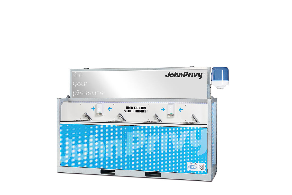 Aspecto fuerte: John Privy®, el innovador concepto de saneamiento por vacío de TOI TOI®, destaca por su gran comodidad, su tecnología de vanguardia y el diseño fresco de sus eventos. Nuestro lavabo ofrece un total de 8 lavabos con tecnología de vacío. Esto garantiza un "flujo" rápido incluso con un gran número de visitantes.
