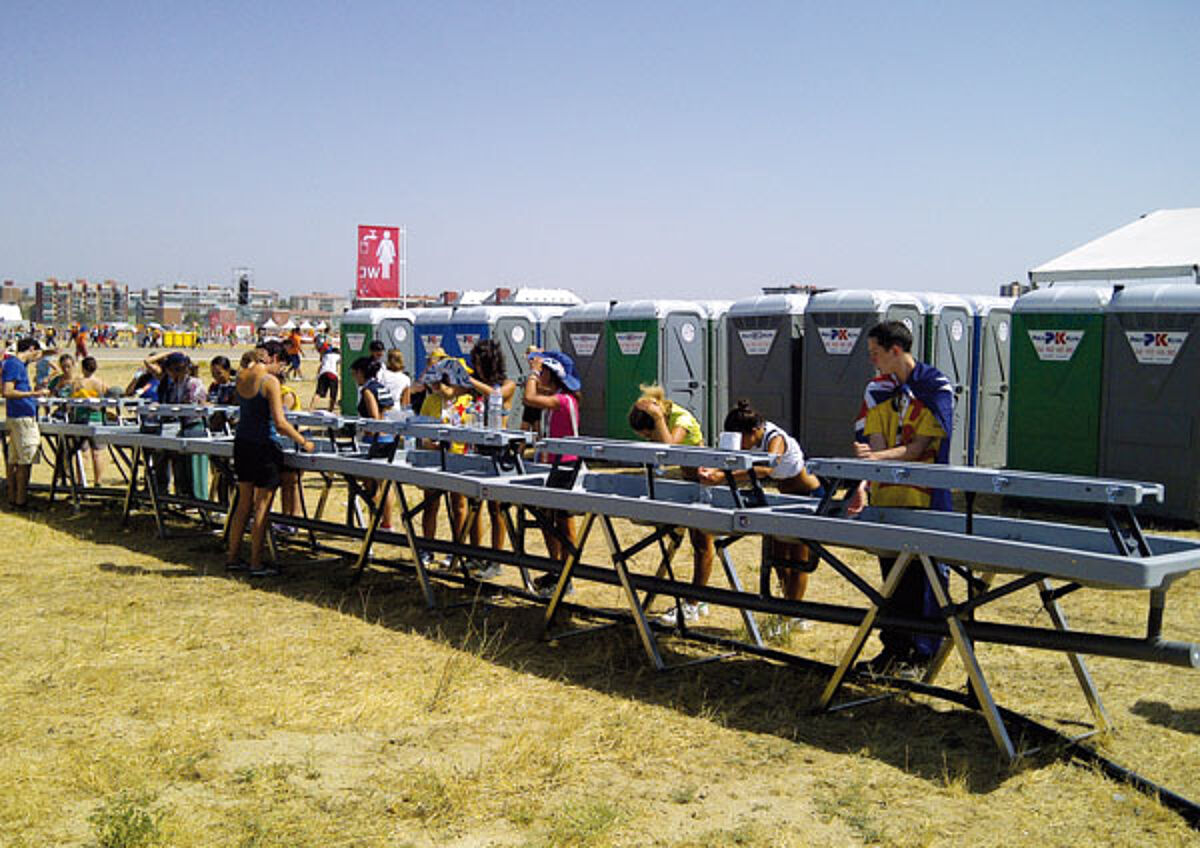 Lavamanos múltiple, portátil, plegable, apilable y ligero. Su estructura permite un fácil montaje en menos de un minuto. Ideal para solventar las necesidades higiénicas en exteriores, como emergencias o eventos públicos.