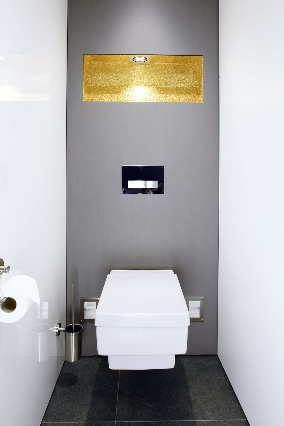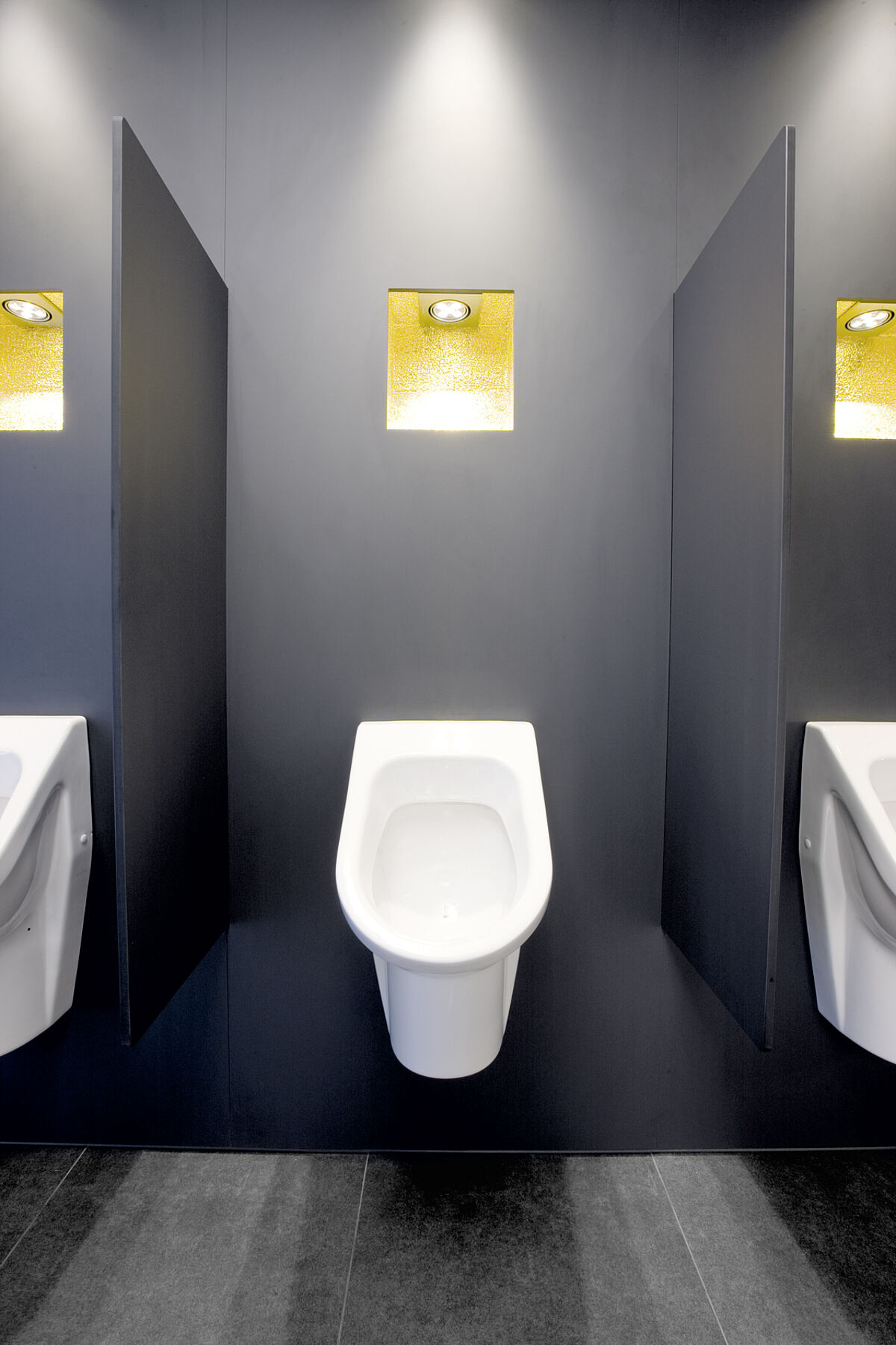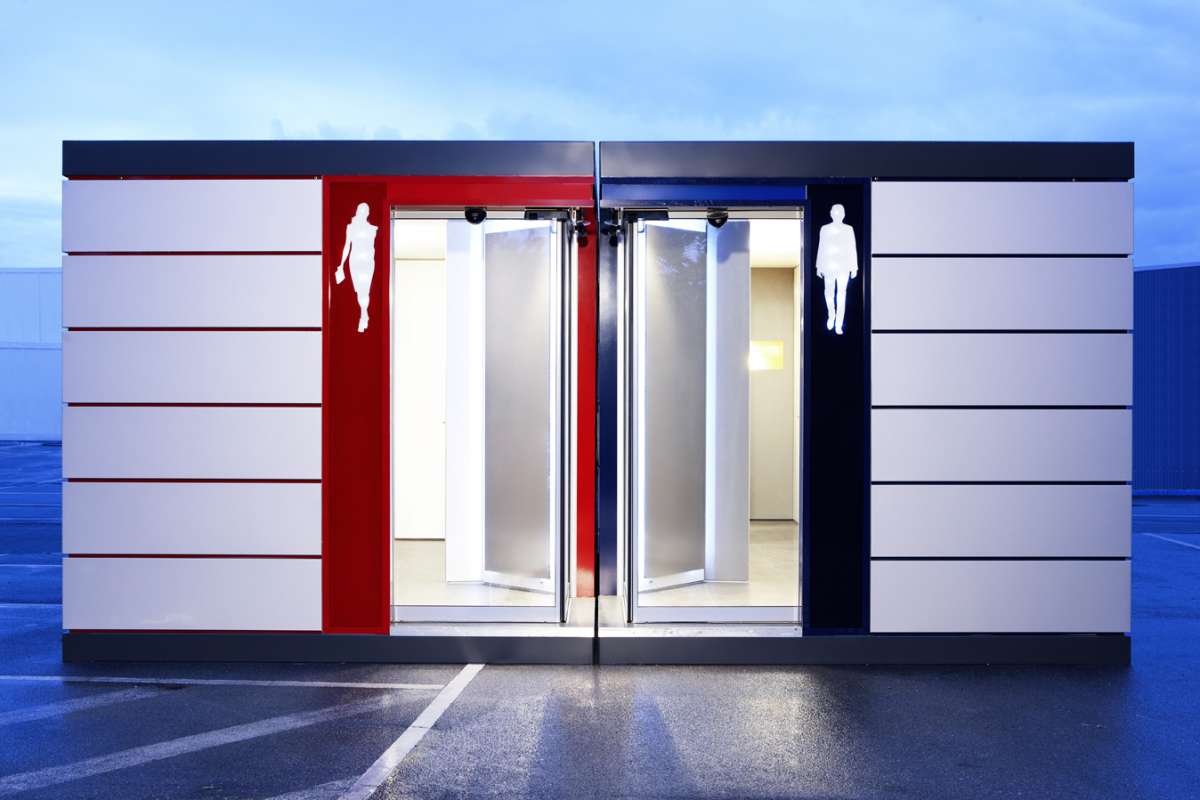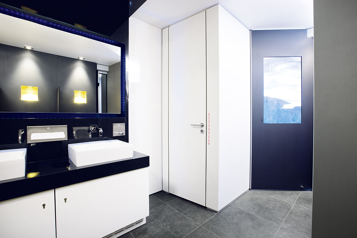 Uma das características especiais deste espaçoso contentor sanitário é o ecrã de 46 polegadas na área de entrada, onde podem ser exibidos, por exemplo, filmes com imagens da empresa. Cabines individuais fechadas à altura da divisão com o seu próprio sistema de exaustão de ar, um display de vago/ocupado com tecnologia LED, acessórios e urinóis sem contacto são outras comodidades contemporâneas.