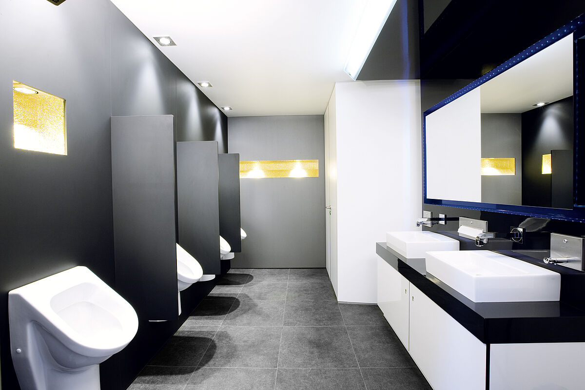 Com o seu equipamento de alta tecnologia e design de luxo, o contentor sanitário masculino TOI TOI® Linha Superior representa uma nova dimensão em módulos sanitários móveis. A casa de banho para ele é muito elegante nas cores preto, branco e cinza e tem uma linguagem de design clara e simples. O foco está na funcionalidade: em combinação com materiais de alta qualidade, resulta num conceito convincente. Dependendo da área, o sofisticado design de iluminação utiliza luz funcional ou ambiente. O aquecimento por piso radiante, ar condicionado, um sistema de aromatização e um sistema de som BOSE garantem um ambiente agradável.