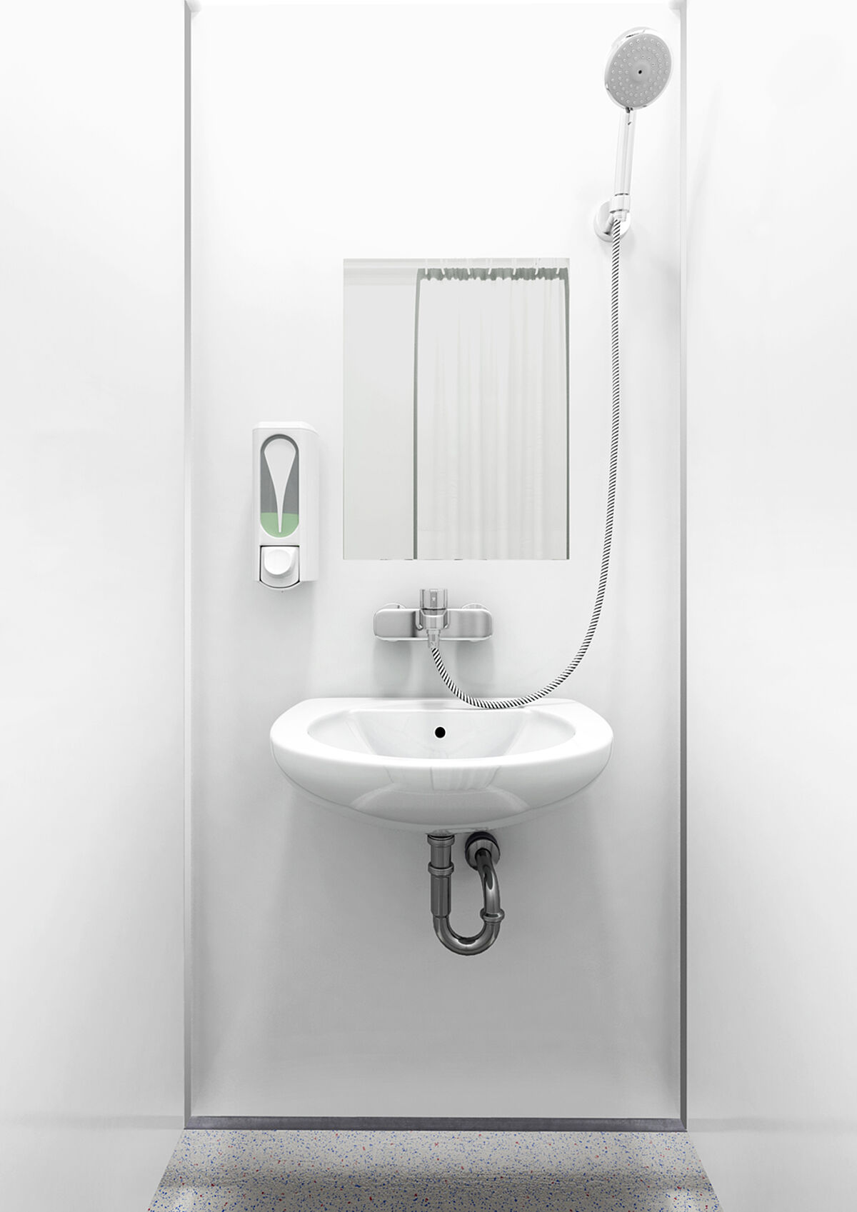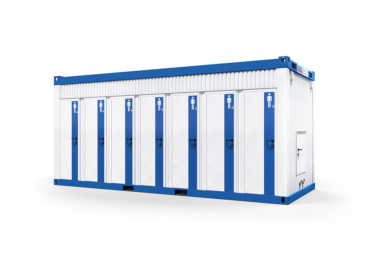 Este módulo de 20 pés tem tudo: sete duches individuais em cada um dos lados longos do módulo. Cada cabine está equipada com um lavatório integrado e uma cortina adicional – o espaço é aproveitado de forma extremamente eficiente.