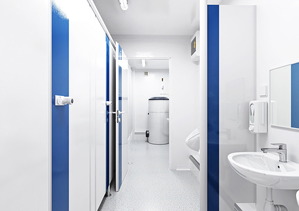 Com este contentor de duche/WC, conseguimos uma verdadeira inovação: a disposição prática de duches, sanitas, lavatórios e depósitos elétricos integra dois contentores num só. Isto permite poupança não só no aluguer, mas também no transporte. Além disso, os nossos acessórios economizadores de água ajudam a proteger o orçamento e o ambiente.