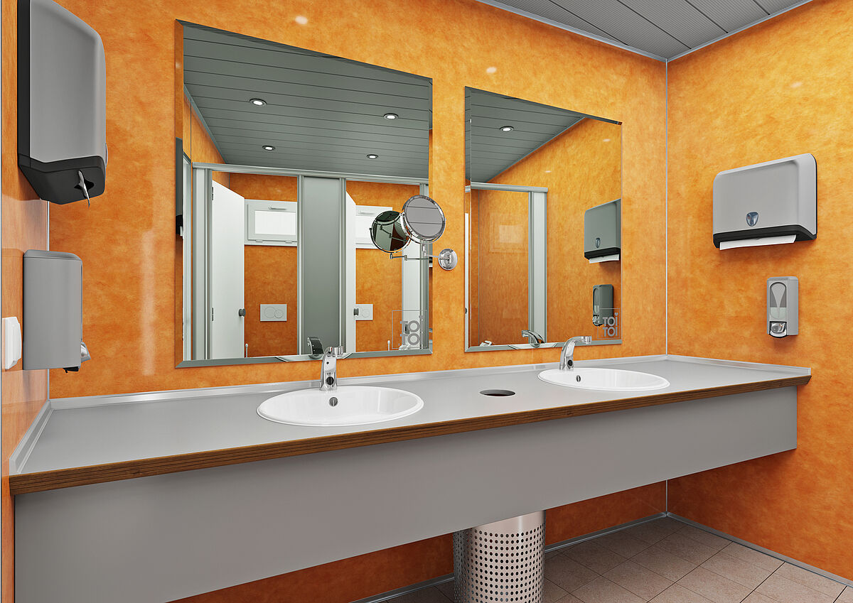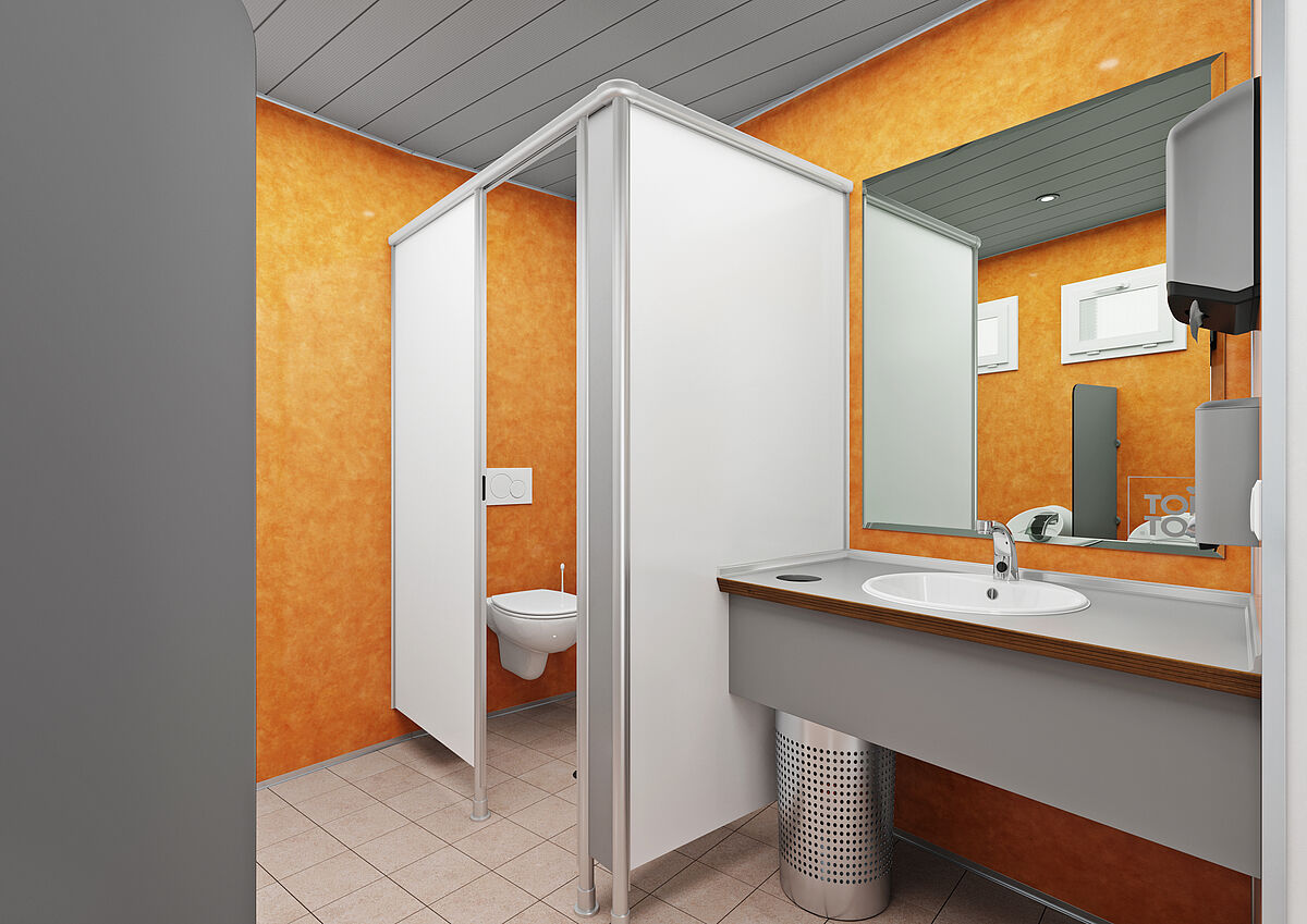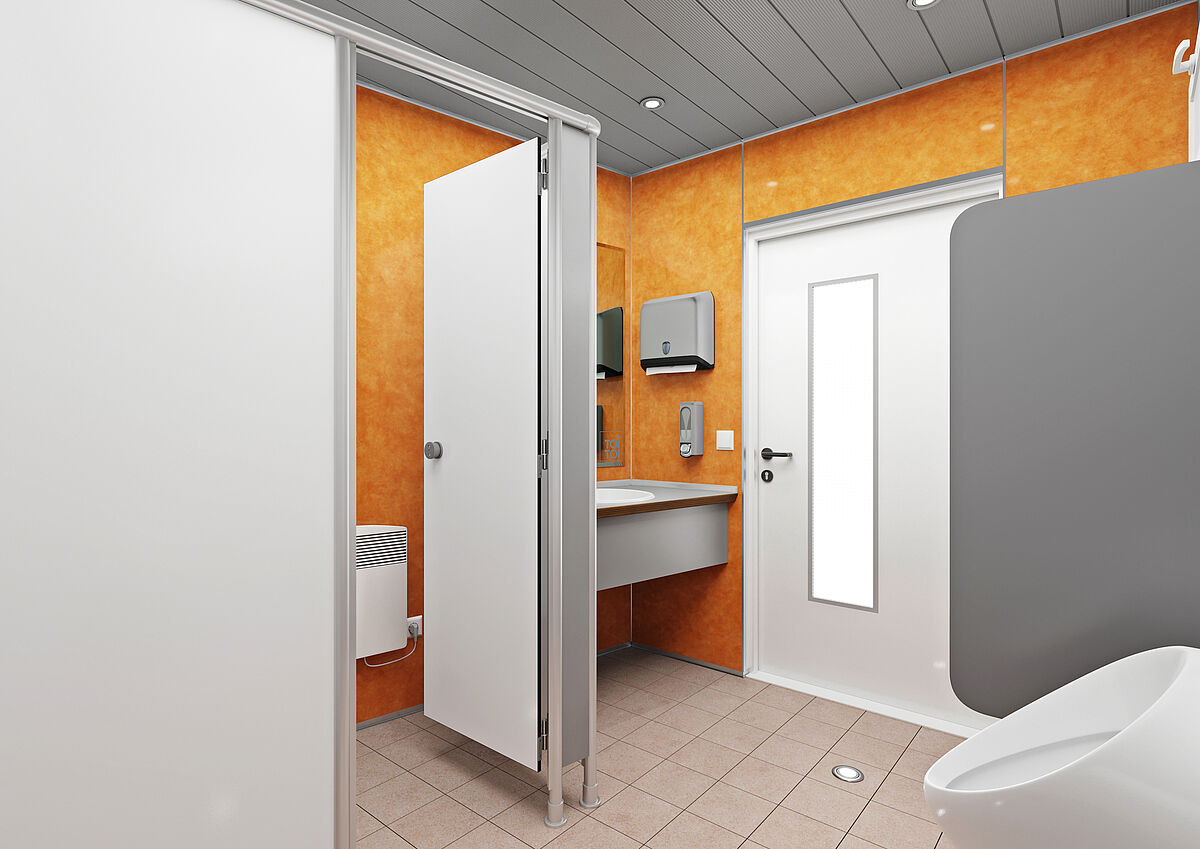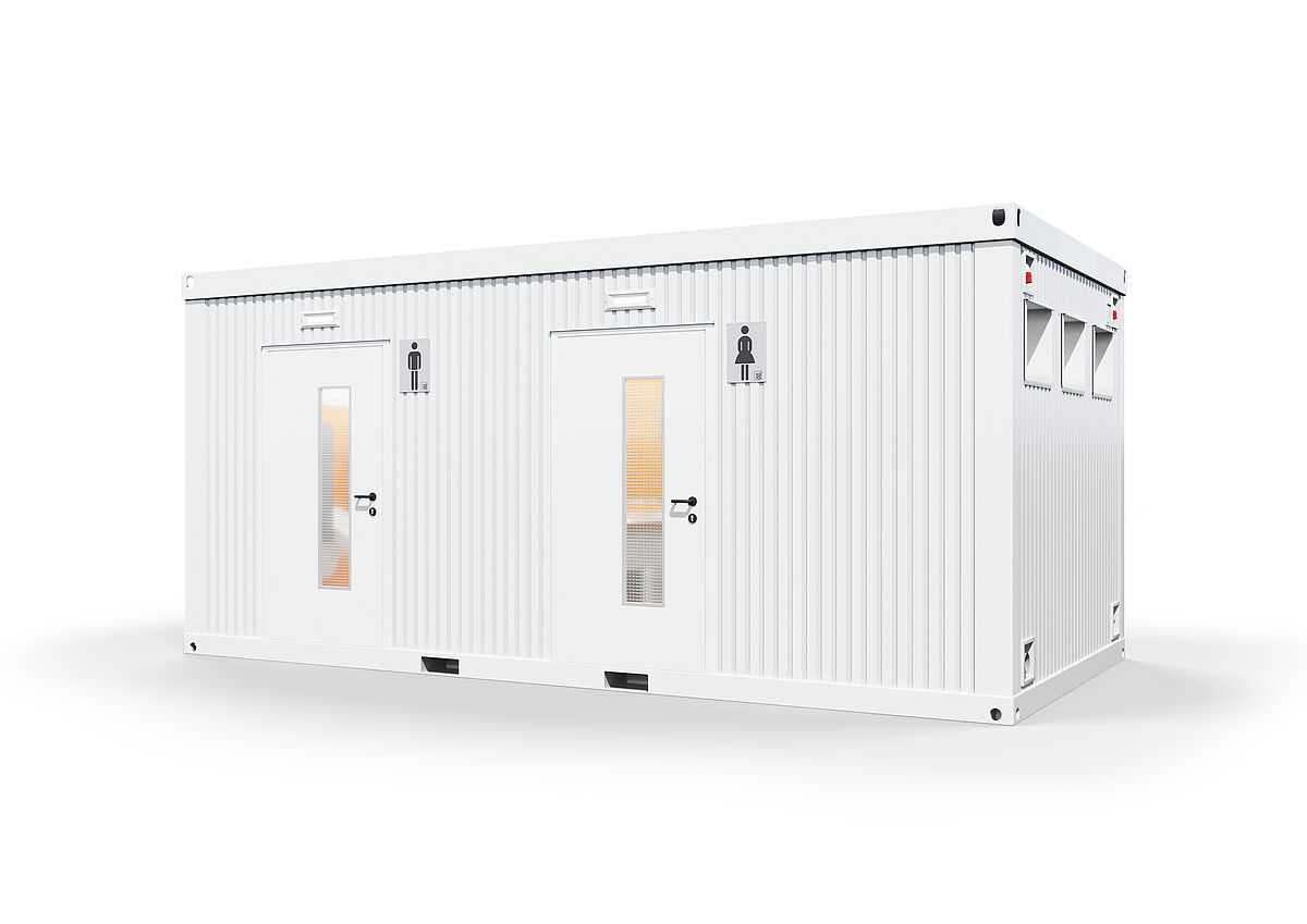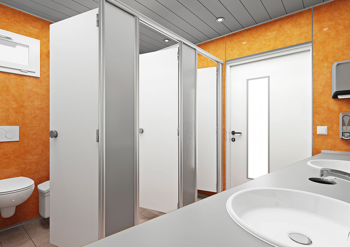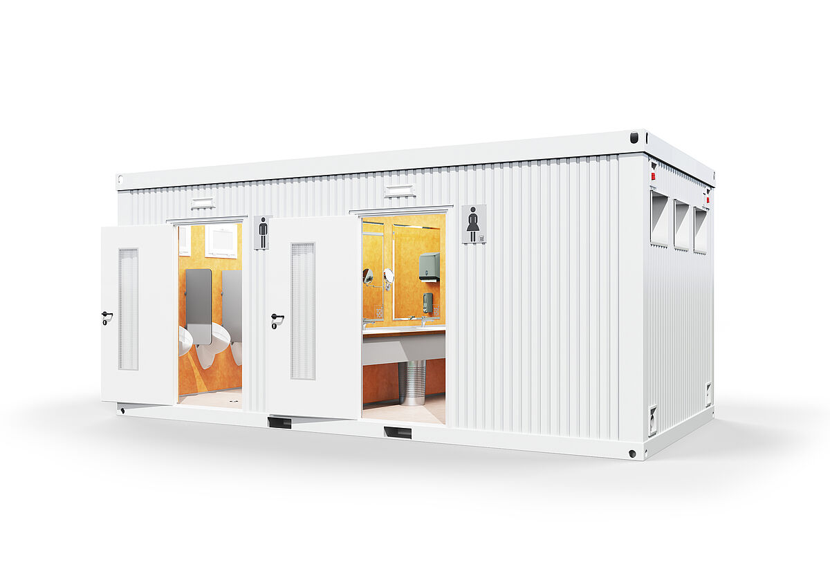 Este módulo inclui zonas separadas para homens e mulheres. Há três cabines de WC e dois lavatórios para mulheres; uma cabine de WC, quatro urinóis com divisórias e um lavatório para homens. Tudo com foco na qualidade superior.