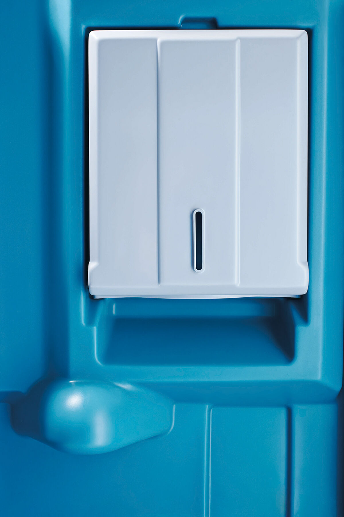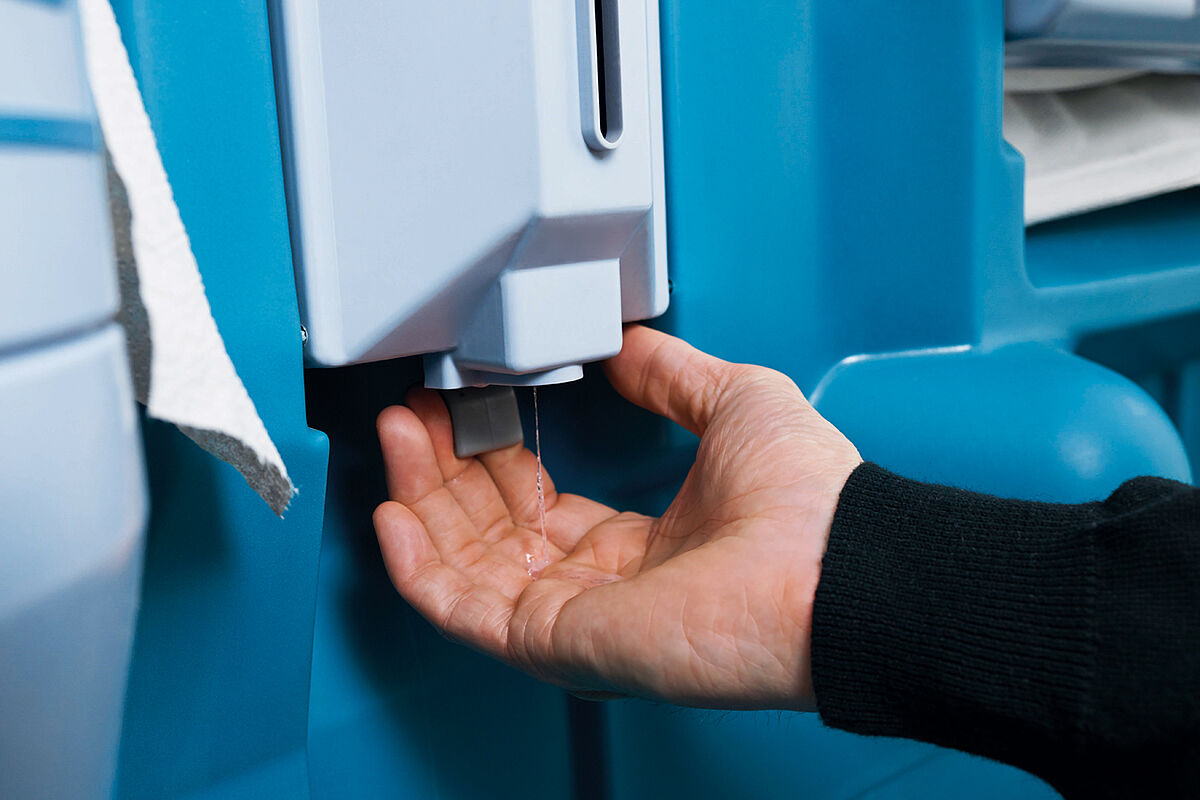 Móvel e completo no seu interior. Para além do WC e do urinário, o equipamento inclui um lavatório extragrande. O TOI® WATER UP satisfaz de forma ótima os elevados requisitos de sanidade na obra, com o seu lavatório especialmente grande, onde é possível lavar até o antebraço inteiro. O TOI® WATER UP garante assim o máximo nível de proteção dos trabalhadores. O pacote de equipamento completa-se com um depósito de água de 60 litros com bomba de pé estável, um doseador de sabão e um doseador de toalhas de papel. A higiene das mãos é garantida com o doseador adicional de desinfeção das mãos.