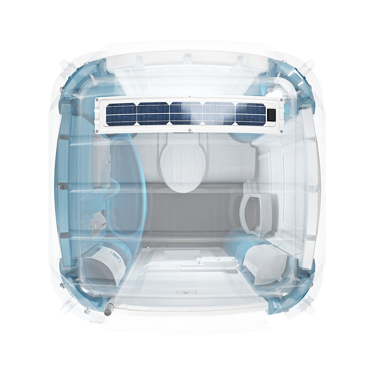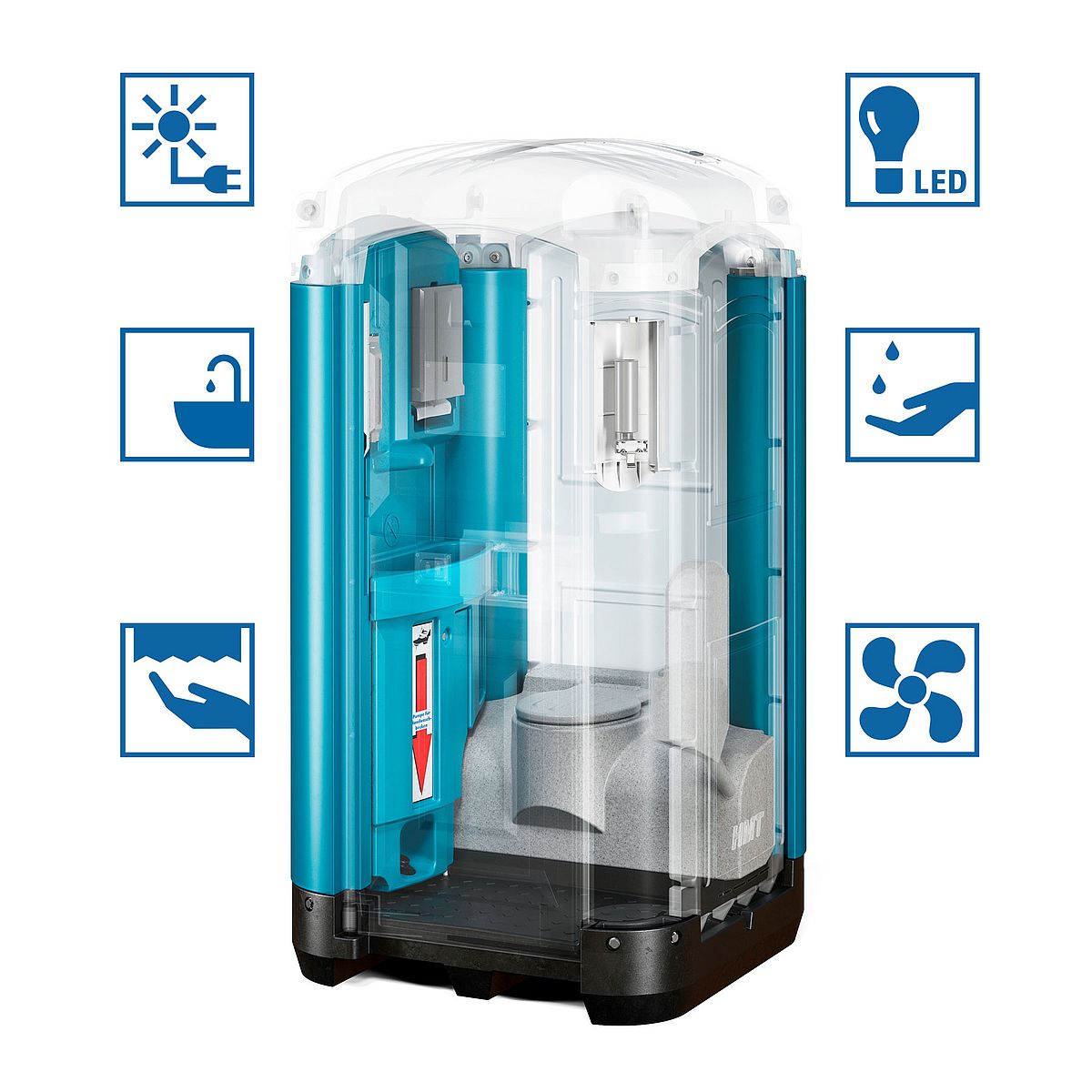 O conforto adicional proporcionado pela luz LED e pelo ventilador está integrado de forma otimizada na parede lateral e é alimentado por um painel solar. O ventilador ventila também o depósito de águas residuais fechado, reduzindo assim os odores. O pacote de higiene e conforto, a fabricação robusta, as cores claras e um design ergonómico e moderno fazem do TOI® WATER UP uma solução imprescindível e um novo padrão para obras e eventos.